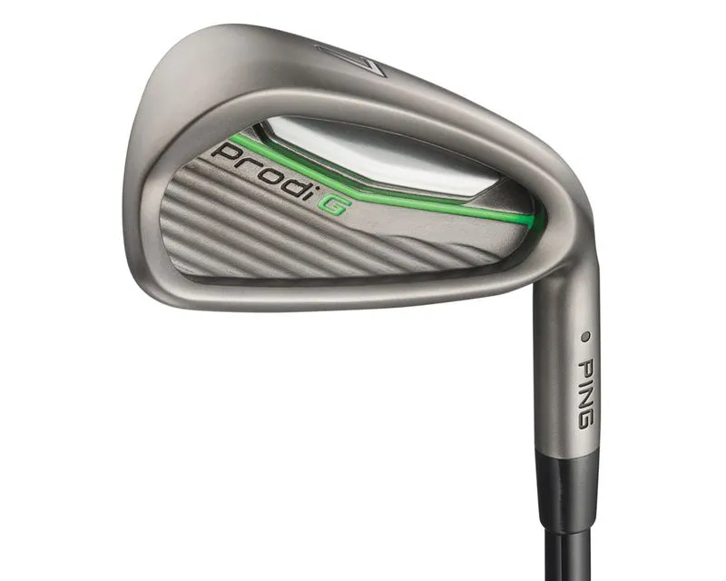 The PING Juniors’ Prodi G Irons are built with17-4 stainless steel heads, perimeter-weighted for forgiveness, and an elastomer insert ensures soft impact. Optimized loft configurations help launch the ball high, far and straight. Prodi G junior clubs offer the same score-lowering technology of our adult sets custom-engineered to fit golfers ages 7 to 13 and between 4′ 5″ and 5′ 2″.