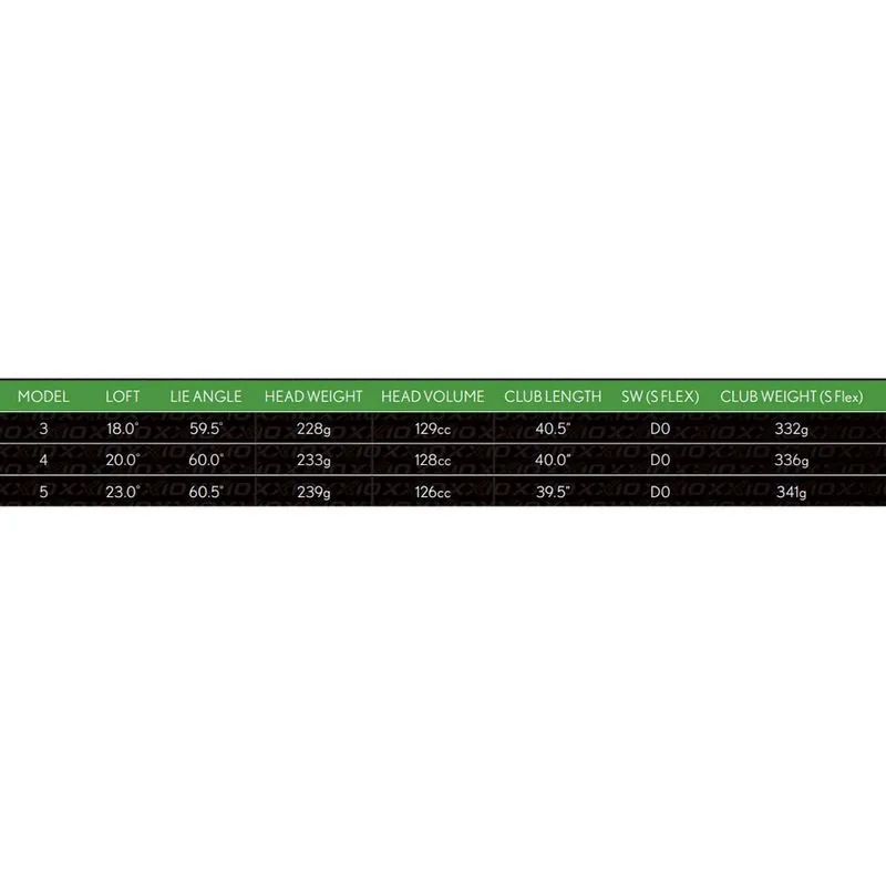 | Club | Loft | Lie Angle | Head Weight | Head Volume | Length | Swing Weight | Club Weight | Flex |